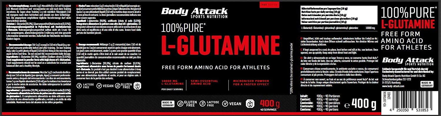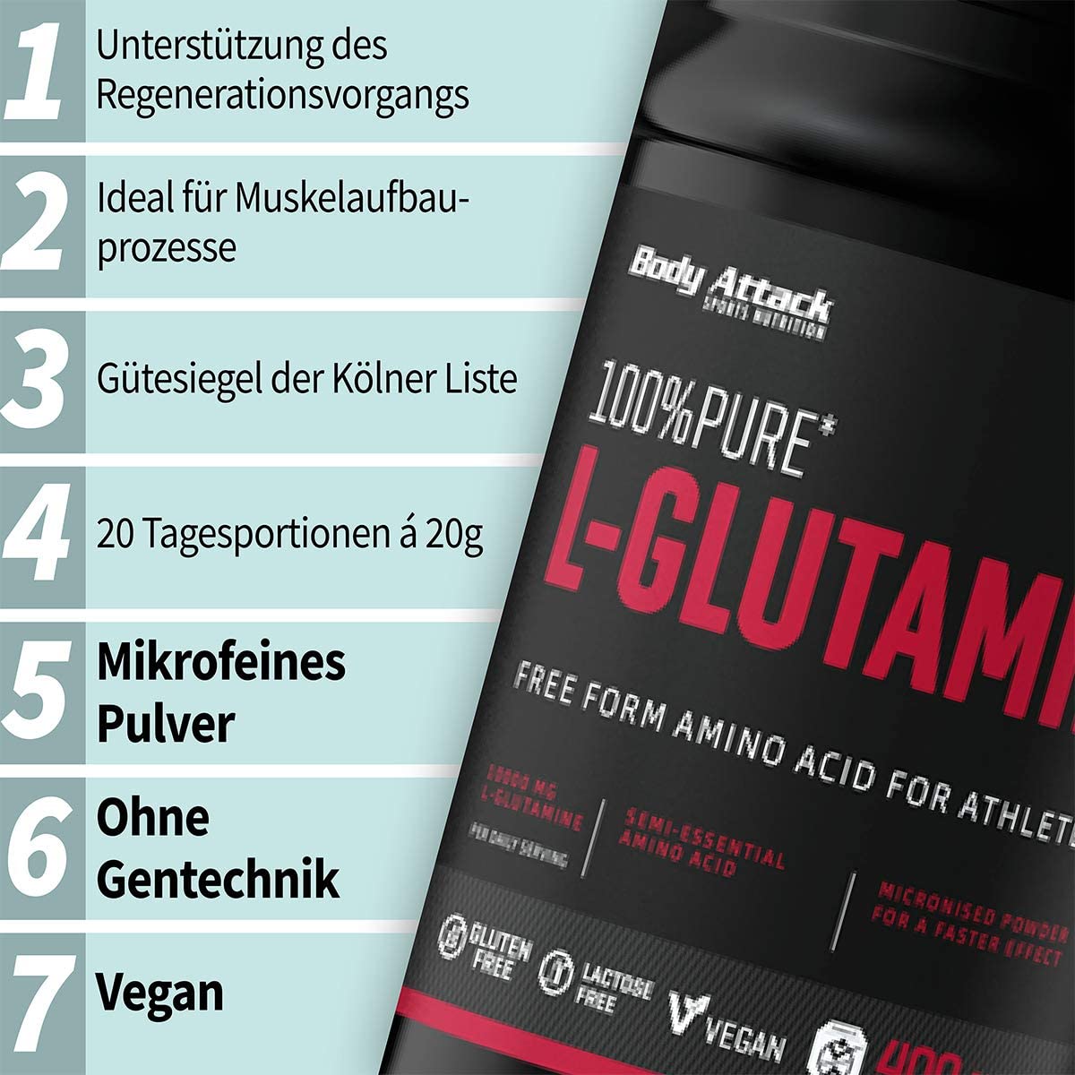 und ein Regenerationsförderer für deine Muskeln ist: Dafür steht das 100% Pure L-Glutamine von Body Attack. Gib deinem Körper die Aminosäure als Baumaterial für deine Muskeln. Damit du auch in den folgenden Workouts weiter Vollgas geben kannst und dich deine Muskulatur bei jedem nochso schweren Eisen nicht im Stich lässt.