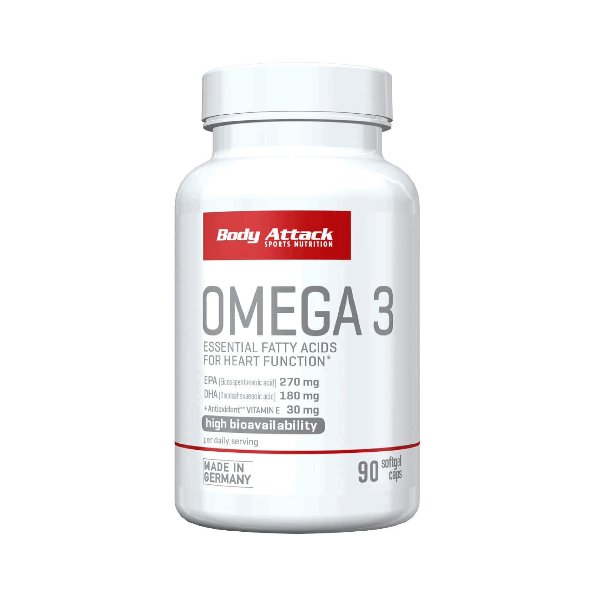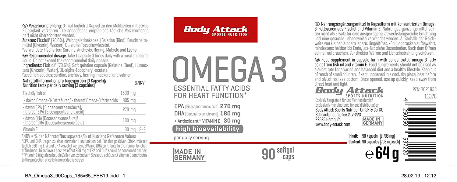 Die Body Attack Omega-3 Softgel Kapseln sind aus reinem Fischöl hergestellt und enthalten 18 Prozent EPA und 12 Prozent DHA. Letzteres kann dazu beitragen, eine normale Gehirnfunktion und Sehkraft zu erhalten (bei einer täglichen Dosis von 250 Milligramm). EPA und DHA tragen in einer Dosierung von 250 Milligramm zu einer normalen Herzfunktion bei.